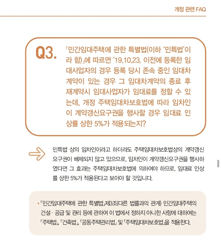 주택임대차보호법 개정후 국토부의 해설서 발표이후 2019.10.23 이전에 임대등록한 임대사업자들은 고민과 스트레스, 분노가 높다 특별법 무시하는 임대차법"···'5% 상한 적용' 해석에 분통 관련 카페에 올라온 글들을 보면 갈팡질팡 혼란스럽고 국토부에 최초임대료 이슈로 민원 넣는 분들도 많다. 그러나 국토부에 민원을 넣은들 대답은 해설서에 있는 내용과 같을 수 밖에 없다. 한입으로 두말할 수가 없으니 말이다. 법률에 따라 확실한 두가지 팩트는 첫째, 2019.10.23 이전 등록한 임대사업자들은 등록 당시 종전임대차계약을 갱신하는 경우에도 최초임대료로 보며 임대료 5%증액제한을 받지 않는다는 것이다. 이것은 법제처의 공식적인 법령해석도 동일하다. 국토교통부 및 민원인 - 임대주택 등록 당시 이미 거주하..